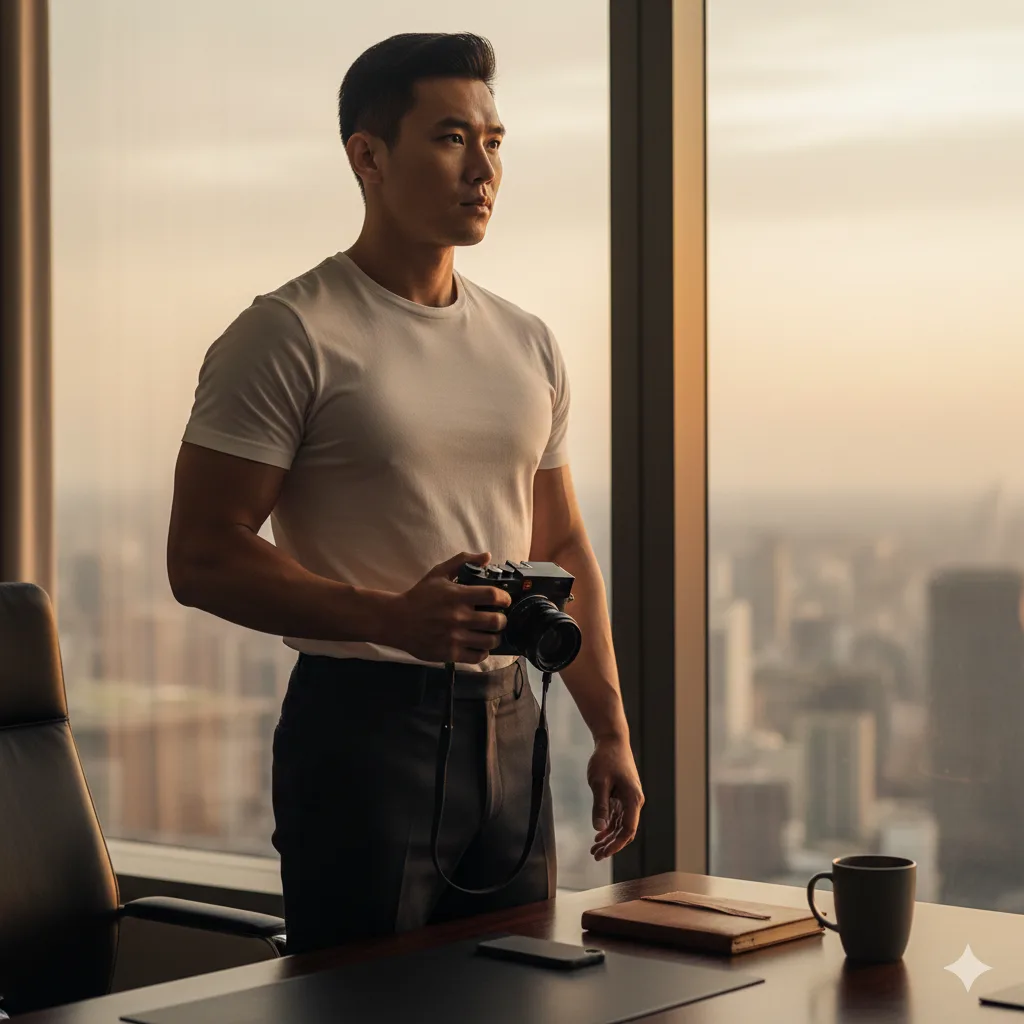 - 戦略: 世界をありのままに、しかし誰よりも鋭く切り取るために本格的なカメラを構える。レンズを通したその視点は、物事の本質を見抜くリーダーの眼差しそのもの。スマホで適当に撮る大衆を横目に、光を操り、真実を記録する。この「重厚な操作感」への投資こそ、妥協を許さないアルファの流儀。