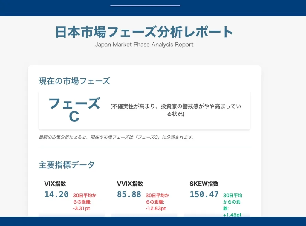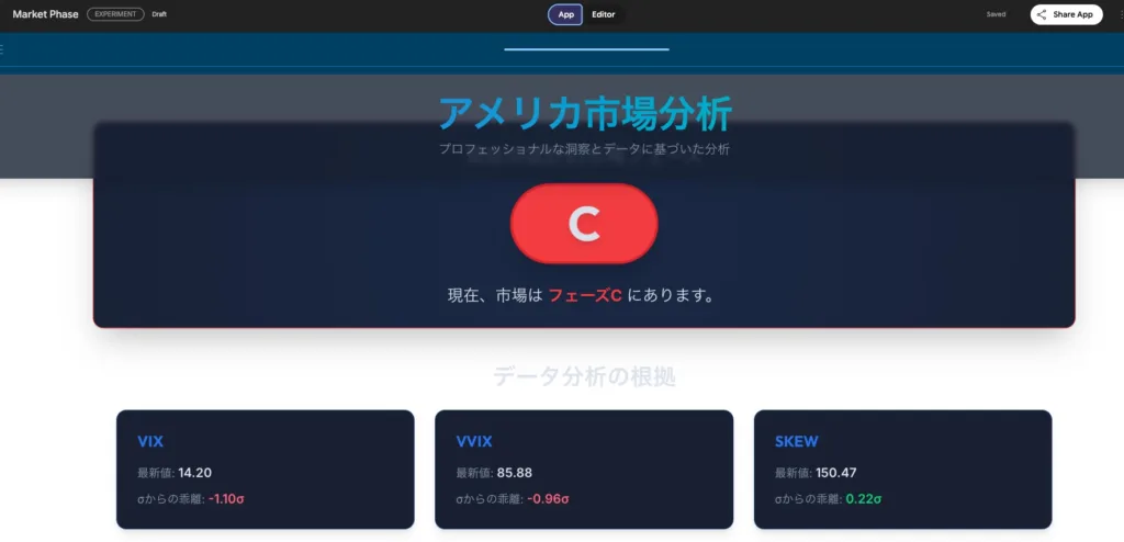 Googleが開発したOpalには文字を入力すると自動でPythonスクリプトを展開してくれる機能がある。カスタムスクリプトがうまく制御できなかった人はユーザーからVIX, VVIX, SKEWデータを貰って以下のスクリプトを実行し日本語で出力するサービスを展開するように指示を出せば10分程度でアプリが作れる。実際に機能するアプリはこちら。判断基準を厳し目に設定し(絶対値を超えるとアラームが鳴るように設定している)関連データが出力しやすいように設定した。テストデータではなく2025年12月30日のリアルなデータを使っている。