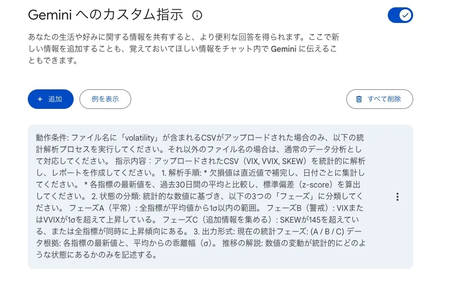 ここにカスタム指示を入力するのだが、指示はGemininに書かせたほうが無難だ。ただしこのカスタム指示が一筋縄ではいかない。