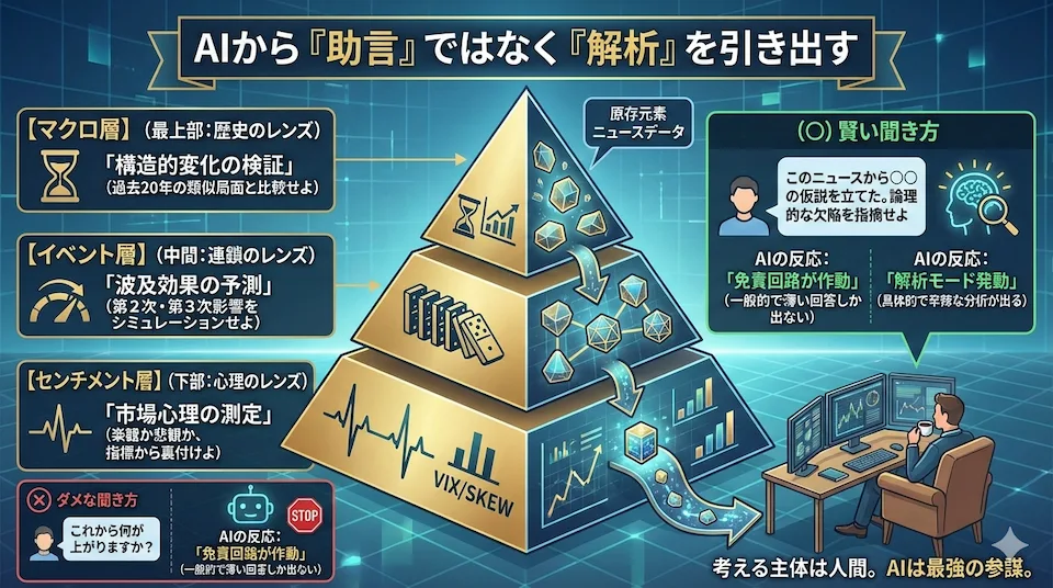 • マクロ層(構造的変化): インフレ、ドル離れ、人口動態など。AIには「過去20年の歴史的類似局面との比較」をさせる