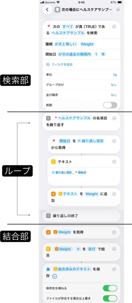 これはAIに聞かないとまず分からないところ。データを1行づつ取り出すためにはループを作成しなければならない。普通のプログラミング言語でいうところのfor eachである。このときに不思議なのは「値(体重)」はそのまま取り出せるという点。しかし開始日を取り出すことができず繰返し項目から明示的に取り出してやる必要がある。おそらくオブジェクトになっているんだろう。